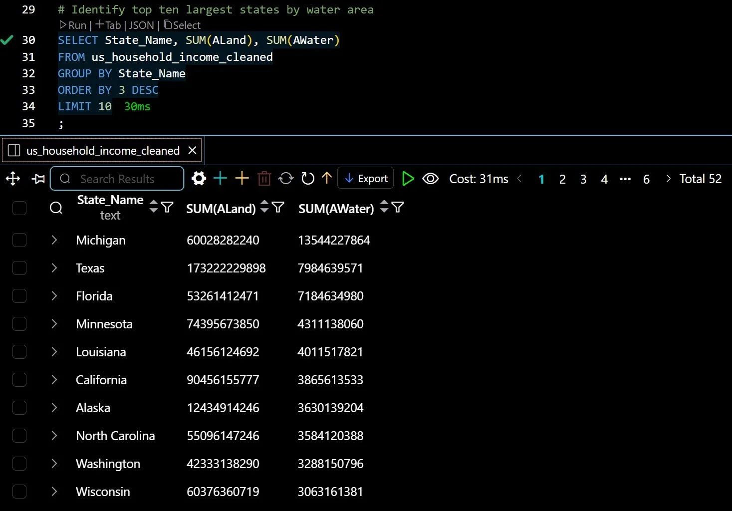 BACKGROUND: Accurate household income data is essential for economic and social policy planning. However, raw datasets often contain issues such as misspellings, duplicate records, and missing values that hinder meaningful analysis. This project addresses those challenges through a structured data cleaning process, followed by SQL-based exploration of trends in income levels and geographic attributes.